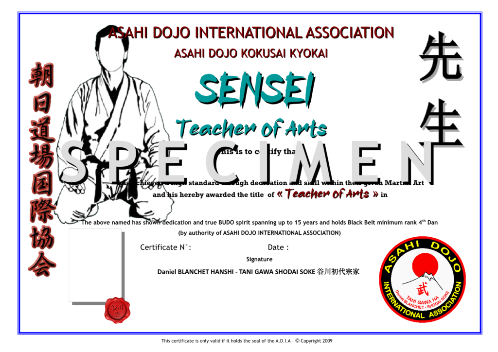 Exemplaire SHOMEI SHO pour YUDANSHA JU JUTSU A.D.I.A